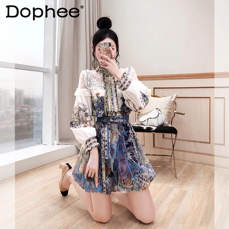 High-End Vintage Skirt Suit Women 2021 Spring New Chic Floral Lace Chiffon Shirt + Pleated Mini Short Skirt 2 Piece Set Outfits