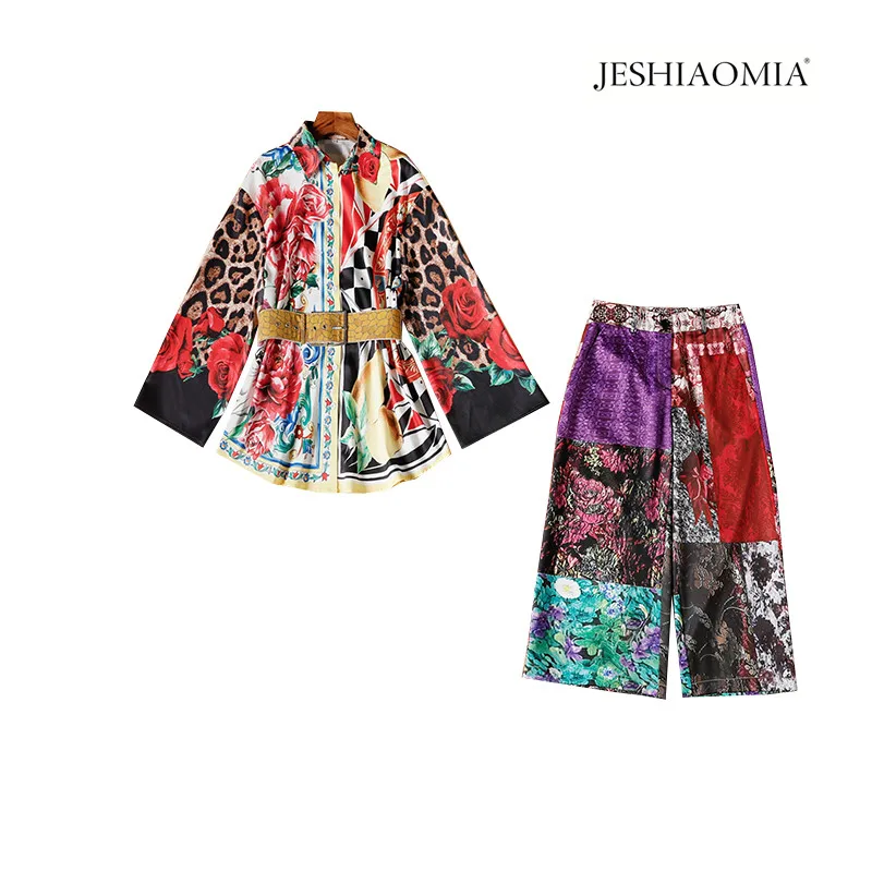 2021 SPRING MULTI COLOR PRINT BELTED TOP & WIDE-LEG PANTS SET